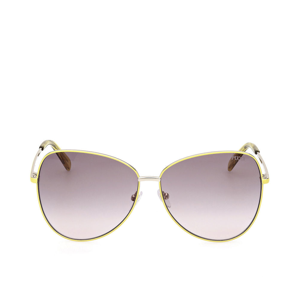 Las gafas de sol modelo EP0207 41F de PUCCI están diseñadas especialmente para mujeres, presentando una estética en forma de mariposa. Su elegante marco de metal destaca en un vibrante tono amarillo, complementado con detalles adicionales. Los lentes cuentan con un atractivo tono marrón degradado. Las dimensiones incluyen un puente de 12 mm, un diámetro de cristal de 61 mm y unas varillas que miden 140 mm.