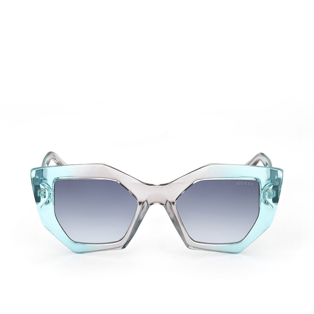 Modelo GU7897 89W de la marca GUESS. Estas gafas de sol femeninas presentan un diseño geométrico. La estructura está fabricada en material inyectado y exhibe tonalidades turquesa junto con otros colores. Los lentes tienen un elegante efecto degradado en azul. Las medidas incluyen un puente de 20 mm, un diámetro de cristal de 50 mm y unas varillas de 140 mm.